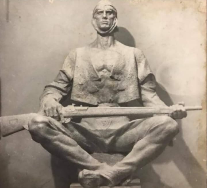 1965. Realizoi skulpturën me titull: ”Në njerën dorë kazmën dhe në tjetrën pushkën”