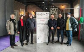 (Në plan të parë Marjana Valla (Eski), Vlash Prifti, Shpëtim Arapi, Fatbardh Marku dhe Vangjo Vasili ne ateljenë e grafikës)