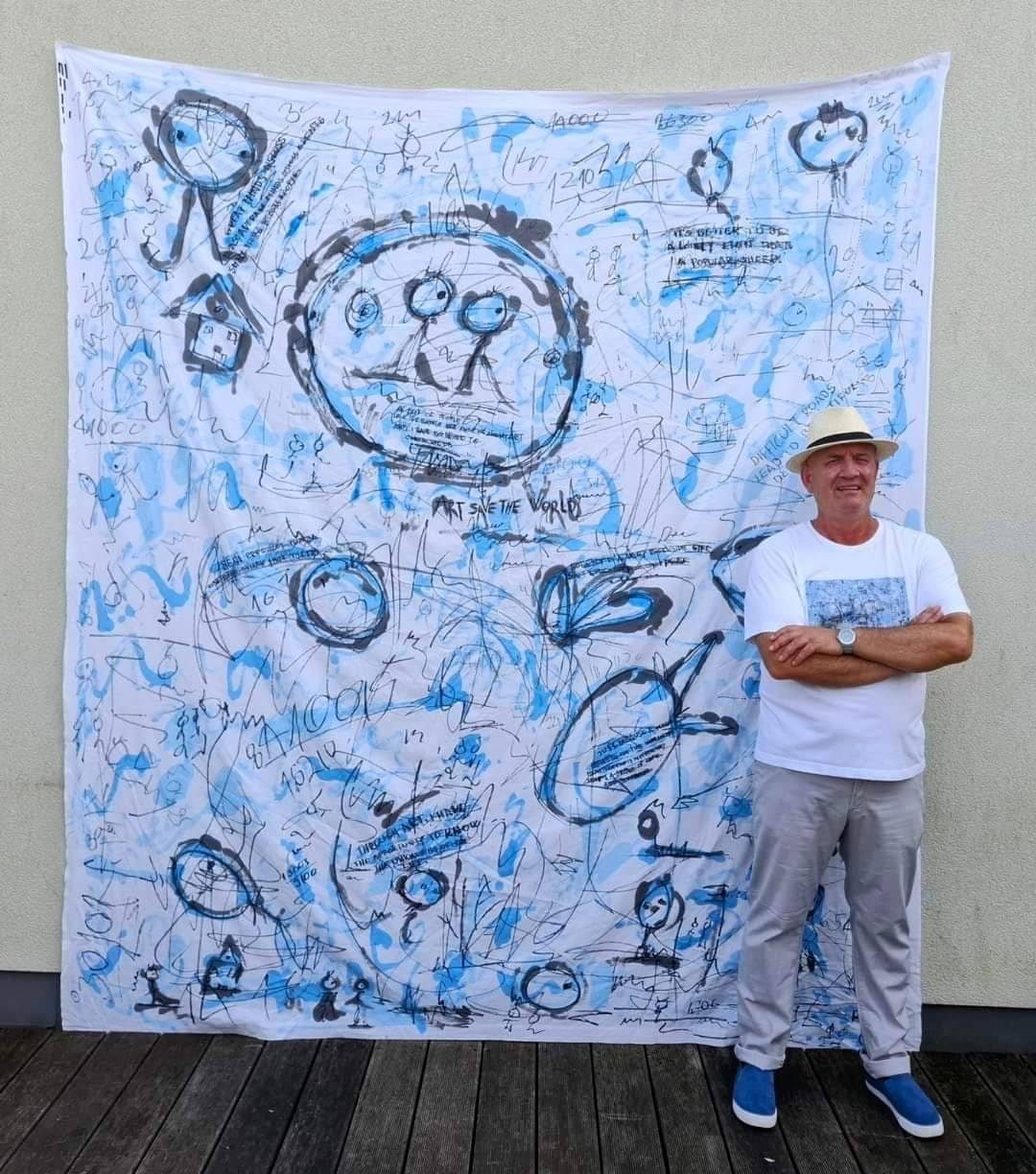 Piktura “Arti shpëton botën” (“Arti Saves the World”), me përmasa 230×260 cm dhe e krijuar me akrilik në pëlhurë, paraqet një rrëfim vizual mahnitës që ndërthur elementë të artit të rrugës dhe ekspresionizmit abstrakt. Me mbishkrime që të kujtojnë gjallërinë e Wall Street-it, vepra artistike i angazhon vazhdimisht shikuesit si vizualisht ashtu edhe konceptualisht.