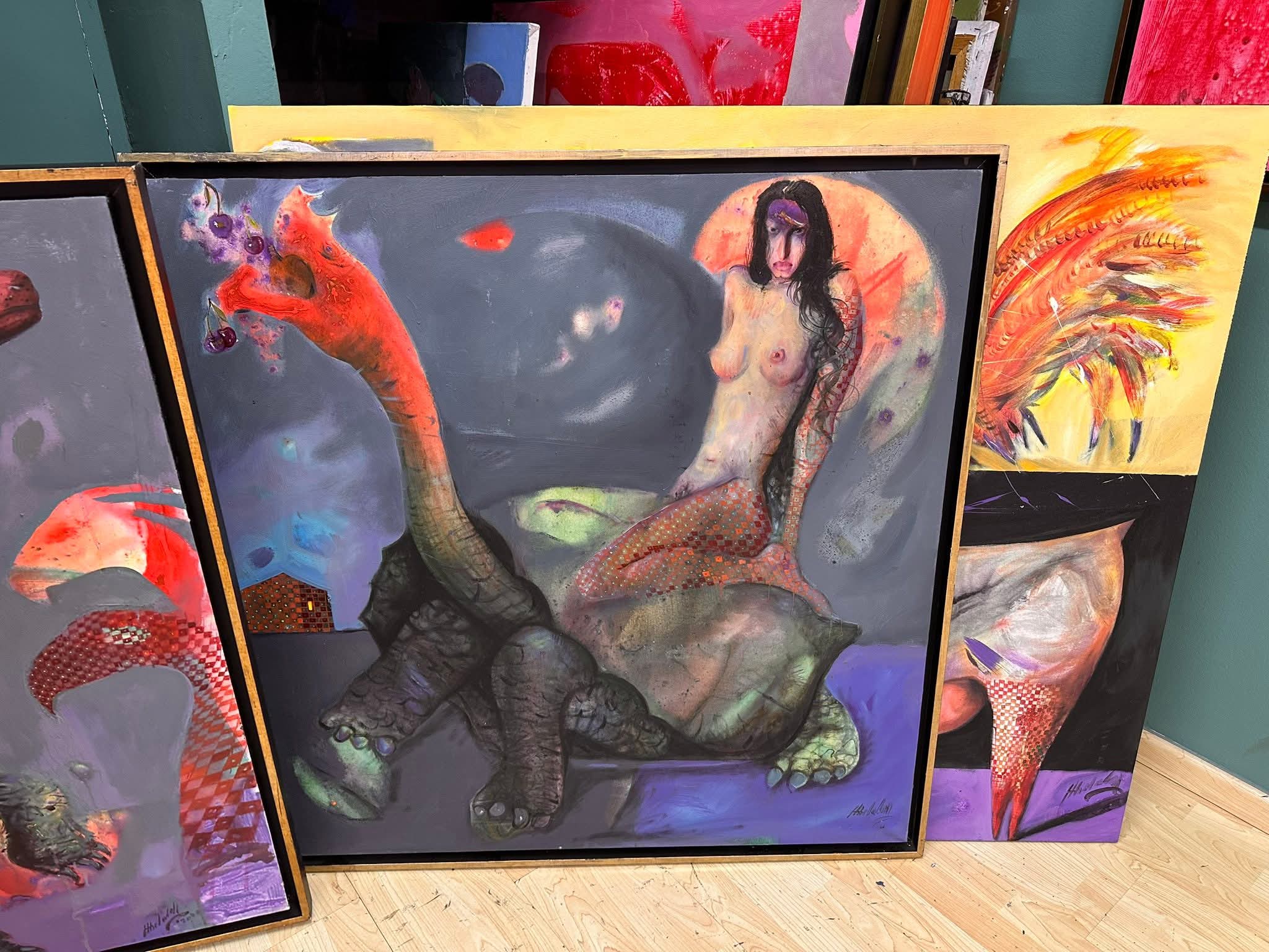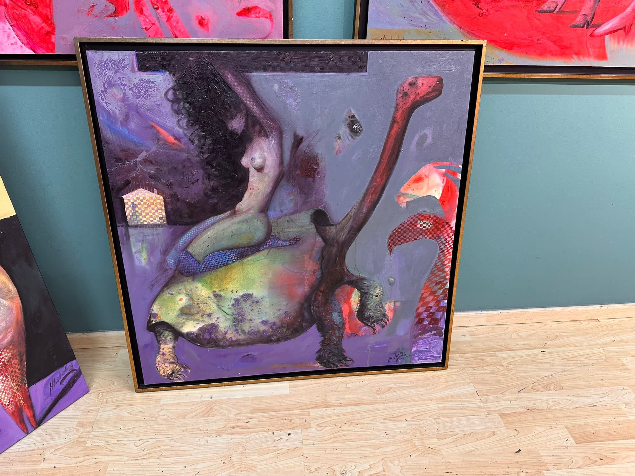 Një punim tejtër që zgjon vëmendjen imponon një kontrast të qetë midis zbutjes së formës dhe ngarkesës ikonografike, trupi i gruas, i modeluar me linja të rrumbullakosura dhe tonalitete të ngrohta, vendoset si figura performuese mbi karkasin monumental të breshkës, i renditur si bazë skulpturore. Ngjyrat funksionojnë në shërbim të hierarkisë lëkura dhe aksentet e ngrohta të trupit të femrës tërheqin vëmendjen, ndërsa skalat e errëta dhe të gjelbërta të breshkës qetësojnë prizmin tonal dhe i japin peshë kompozicionit. Raporti formë masë krijon një tension simbolik, lëvizshmëria e trupit njerëzor kundrejt ngadalësisë së breshkës prodhon një alegori të qëndrueshmërisë, mbështetjes dhe ndoshta mbizotërimit të instiktit mbi natyrën. Aplikimi i bojës midis pasazheve të lëmuara dhe goditjeve të dukshme forcon prezencën materialiste të objekteve, duke lënë një gjurmë të qartë performative në shenjtërimin e skenës. Surrealizmi shfaqet në bashkimin e papritur të trupit femëror me trupin e breshkës një përzierje që sfidon logjikën dhe krijon një hapësirë ëndërrore. Imazhet simbolike vendosin një dialog psikik dhe mitologjik, ku metafora kthehet në një imazh të fuqishëm dhe të shumëkuptueshëm.