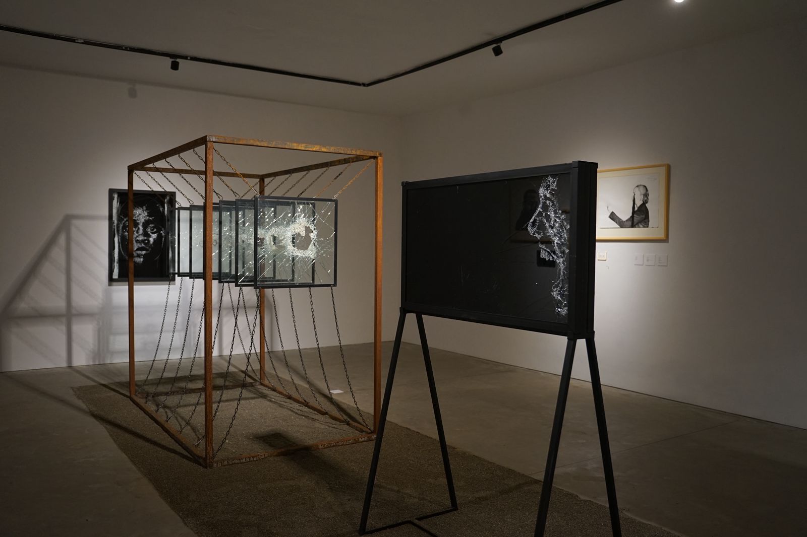 Puna kryesore e Aron Nokës ndërkohë është një instalacion hapësinor me hekur, xhama të thyer dhe gurë mineralesh të sjella nga miniera e Bulqizës – një peizazh industrial ku puna, rreziku dhe humbja e jetës janë shqetësime të përditshme. Instalacioni i tij funksionon si një galeri e mirëfilltë, si në kuptimin e minierës ashtu edhe të institucionit: Noka ndërton një kor-ridor material ku metali, qelqi, figura dhe lëvizja janë në tension të vazhdueshëm. Narrativa e zhvendosjes së vëmendjes mes dy shikimesh – në fillim dhe në fund të instalacionit – e hallakat qëllimisht fillimin dhe mbylljen e veprës dhe të kuptimit; spektatorit i lihet të imagjinojë vetë nëse britma vjen pas krismës apo nëse habia paraprin aktin.