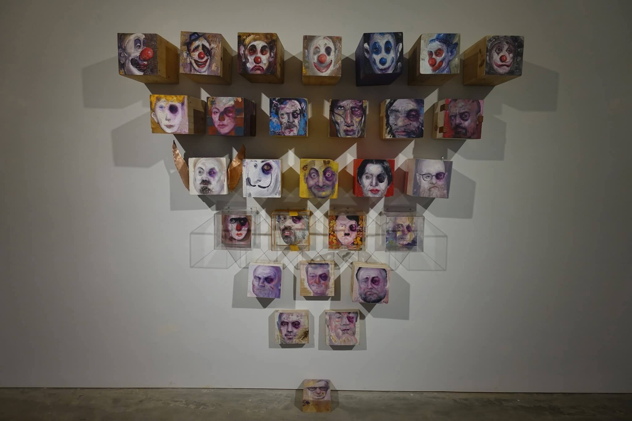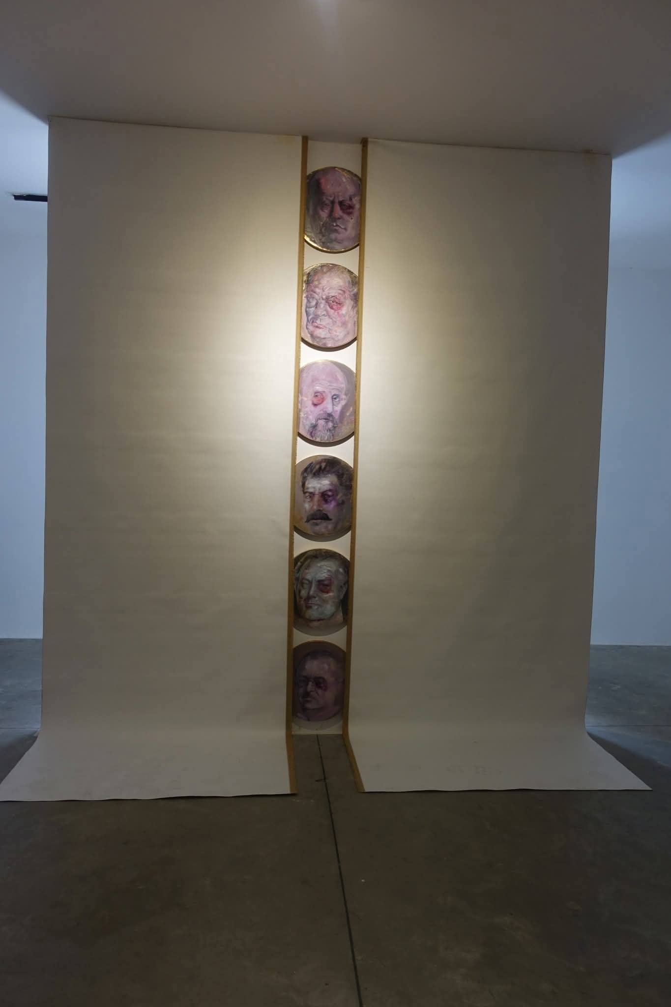 Duke e përjetuar thellë risinë e inteligjencës artificiale, pikturi që në mëngjes, ditë për ditë e për një kohë të gjatë e vinte atë në provë në shtyrjen e kërkimit dhe qëllimit, se ku donte të arrinte, por edhe shpesh bashkëbisedonte me të, i kërkonte mendim dhe ndryshimin e asaj që i paraqiste. Ishin si të thuash dy mendje që udhëhiqeshin nga logjika e artistit në bashkëveprim. Një punë e lodhshme, se asnjëherë nuk i duhej ta lëshonte mendimin nga qëllimi i vënë. E njëjtë me procesin e boceteve apo vizatimeve të shumta për të mbrritur në kompozimin fundor, atë që do shpërfaqej si një e tërë organike në muret e ekspozitës. Ndonëse sasia e tablove dhe e personazheve është më e madhe se sa janë paraqitur, artisti nuk ka nguruar të mënjanojë e të shmangë shumë syresh për të mos e ngarkuar shumë ekspozitën, për të dhënë më frymëmarrje, ku shikimi i spektatorit të mos “bombardohet” nga një portret në tjetrin, por çdo portret të ngulet mirë në mendjen e tij dhe të bëjë të mundur shumëfishimin e mesazhit dhe rritjen e forcës së tij duke mos kursyer askënd sado i pushtetshëm nën goditjen e penelit të tij, aq sa çdokush me një fije pushtet apo pozitë ta ndjejë nën lëkurë mesazhin.